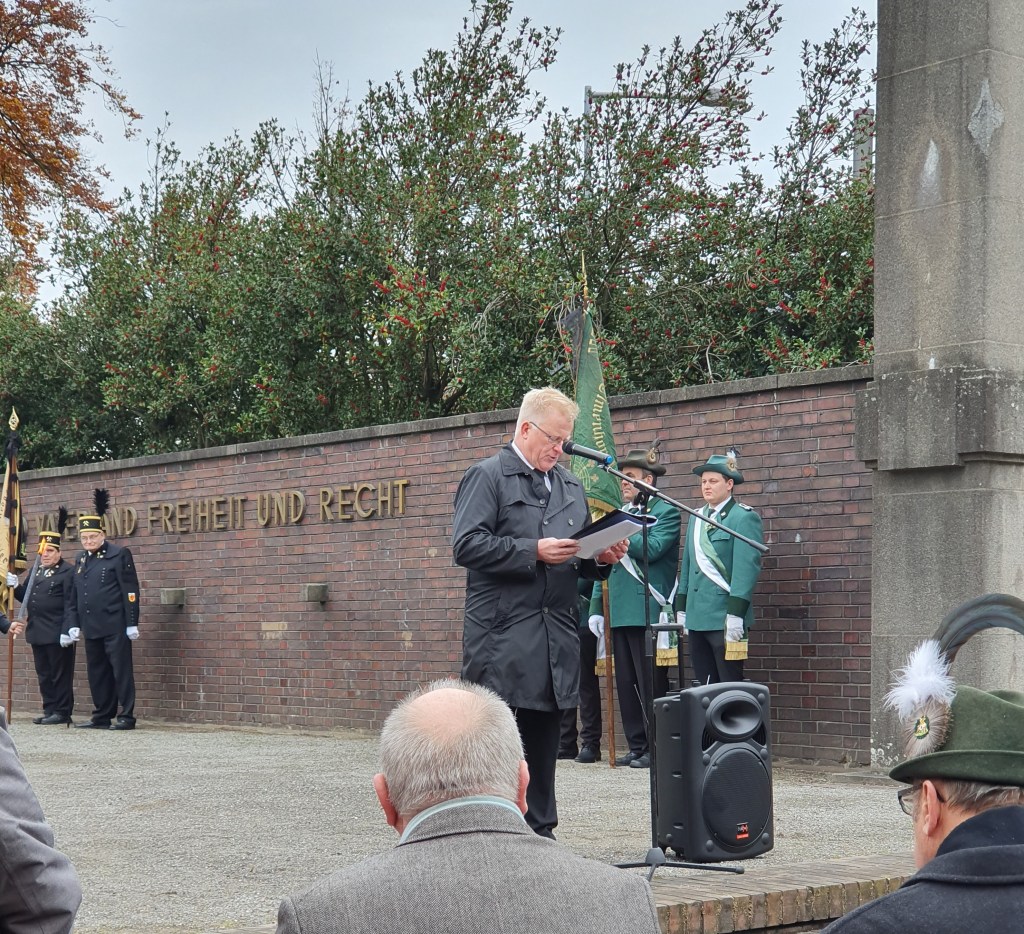 Auch in diesem Jahr nahmen wir an der Gedenkfeier zum Volkstrauertag teil. Trotz des Kälteeinbruchs war die Gedenkfeier gut besucht. Alle Teilnehmer folgen aufmerksam den Worten von Martin Fleischmann, Pfarrerin Friederike Scholz-Druba und Gerd Oldenburg. Frieden und Freundschaft sind nicht selbstverständlich, sondern erfordern ständig einen Dialog zwischen den Menschen. Krieg ist keine Lösung. Mit dem gemeinsamen Singen der Nationalhymne wurde die Veranstaltung beendet.
